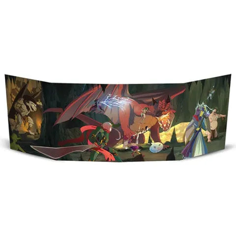 This handy, 4-panel reference screen for Masters of the Dungeon features a one-stop location for important Anime 5E tables, wrapped in a stunning full-colour panoramic image on the front that expands the dragon lair Anime 5E cover image scene with additional characters and monsters.