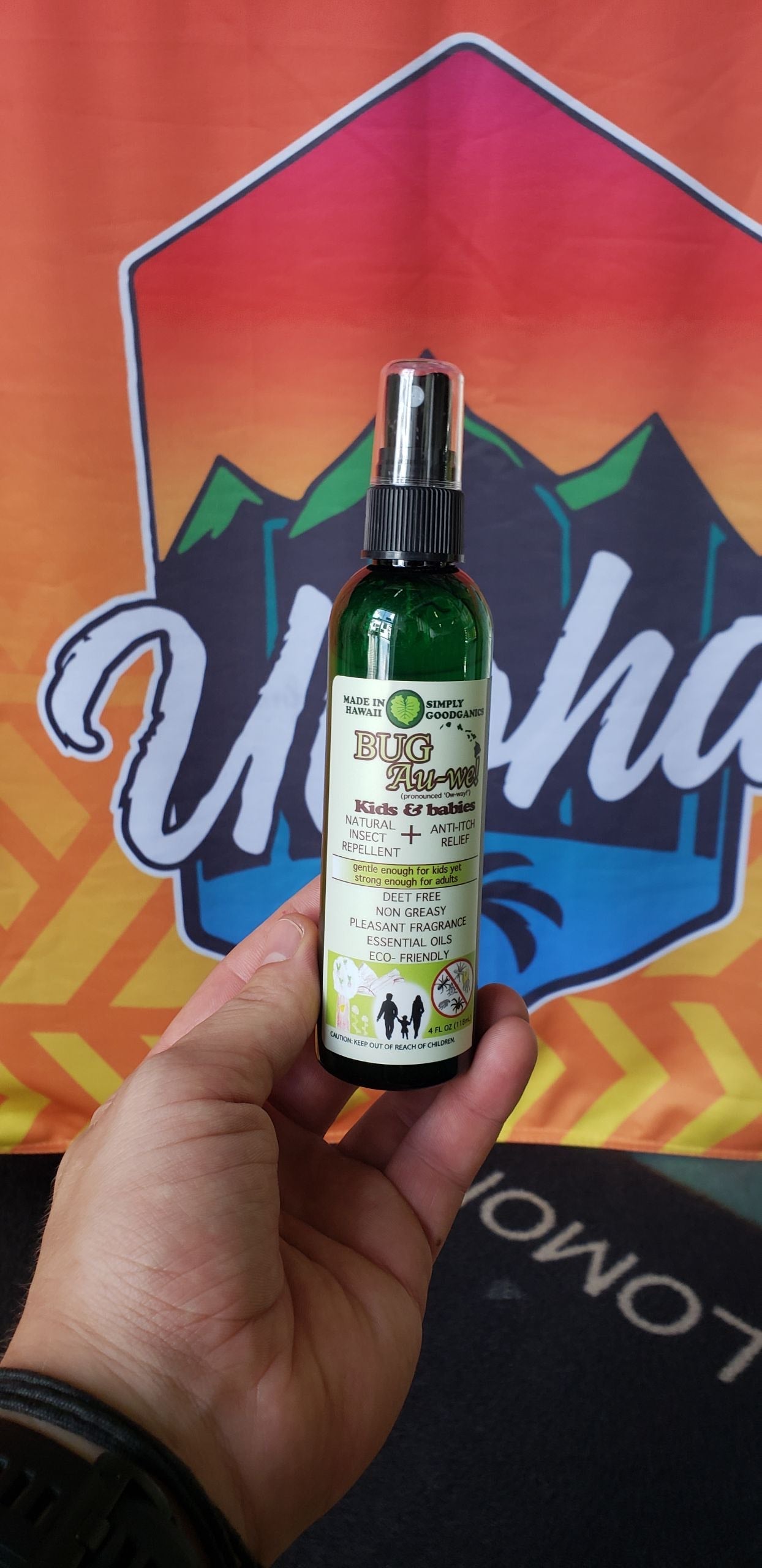 All natural bug repellant made right here in Hawaii!  DEET free, made with citronella and aloe vera, and infused with essential oils of witch hazel, lemongrass, apricot oil, and tea tree.  Eco friendly with no added colorants, repels mosquitoes, ants, ticks, flies, spiders & sandflies.